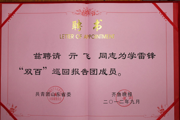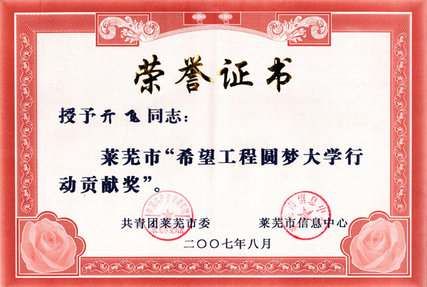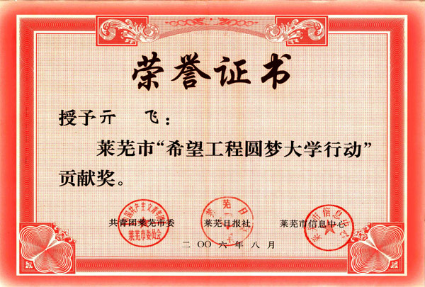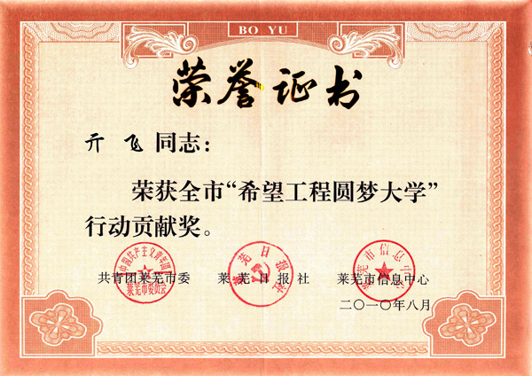 • > 亓飛,被萊蕪市共青團、信息中心授予“希望工程圓夢大學行動貢獻